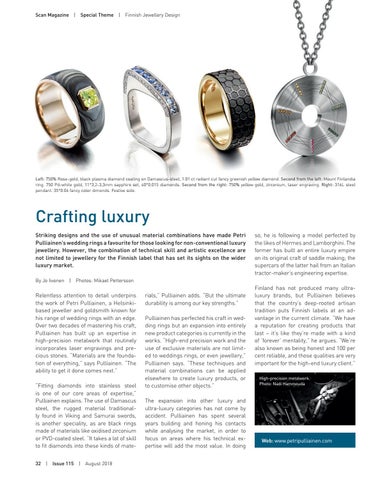 Relentless attention to detail underpins the work of Petri Pulliainen, a Helsinkibased jeweller and goldsmith known for his range of wedding rings with an edge. Over two decades of mastering his craft, Pulliainen has built up an expertise in high-precision metalwork that routinely incorporates laser engravings and precious stones. “Materials are the foundation of everything,” says Pulliainen. “The ability to get it done comes next.” “Fitting diamonds into stainless steel is one of our core areas of expertise,” Pulliainen explains. The use of Damascus steel, the rugged material traditionally found in Viking and Samurai swords, is another speciality, as are black rings made of materials like oxidised zirconium or PVD-coated steel. “It takes a lot of skill to fit diamonds into these kinds of mate32 | Issue 115 | August 2018