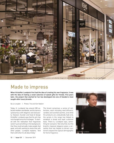 Today, K. Lundqvist has around 200 selected retailers worldwide, and its name is synonymous with elegance and exclusivity. However, founder and head of design Kristoffer Lundqvist says that his aim has not changed since he first began. “It started with the realisation that fragrances weren’t just something in the background, that they could actually make people feel good, and with wanting to share that with other people,” Lundqvist explains. “And that’s still what it’s all about today.” 12 | Issue 131 | December 2019