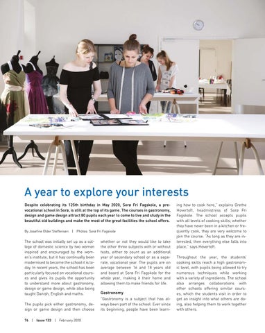 ing how to cook here,” explains Grethe Hovertoft, headmistress of Sorø Fri Fagskole. The school accepts pupils with all levels of cooking skills; whether they have never been in a kitchen or frequently cook, they are very welcome to join the course. “As long as they are interested, then everything else falls into place,” says Hovertoft. Throughout the year, the students’ cooking skills reach a high gastronomic level, with pupils being allowed to try numerous techniques while working with a variety of ingredients. The school also arranges collaborations with other schools offering similar courses, which the students visit in order to get an insight into what others are doing, also helping them to work together with others.
