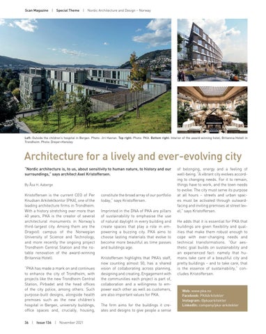 Kristoffersen is the current CEO of Per Knudsen Arkitektkontor (PKA), one of the leading architecture firms in Trondheim. With a history stretching over more than 40 years, PKA is the creator of several architectural monuments in Norway’s third-largest city. Among them are the Dragvoll campus of the Norwegian University of Science and Technology, and more recently the ongoing project Trondheim Central Station and the notable renovation of the award-winning Britannia Hotell. “PKA has made a mark on and continues to enhance the city of Trondheim, with projects like the new Trondheim Central Station, Pirbadet and the head offices of the city police, among others. Such purpose-built designs, alongside health premises such as the new children’s hospital in Bergen, university buildings, office spaces and, crucially, housing, 36 | Issue 136 | November 2021