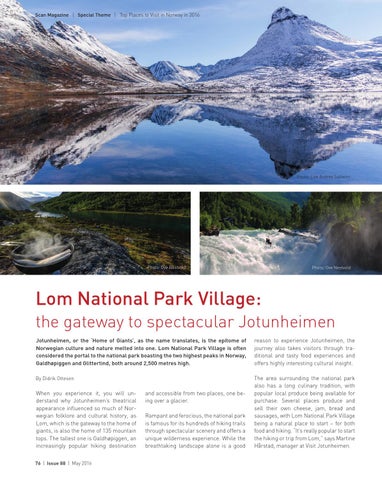When you experience it, you will understand why Jotunheimen’s theatrical appearance influenced so much of Norwegian folklore and cultural history, as Lom, which is the gateway to the home of giants, is also the home of 135 mountain tops. The tallest one is Galdhøpiggen, an increasingly popular hiking destination 76 | Issue 88 | May 2016