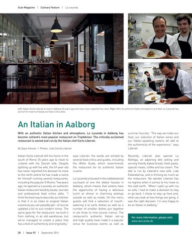 Italian Carlo Liberati left his home in the south of Rome 25 years ago to move to Jutland with his Danish wife. Despite splitting up with his wife, the 49-year-old has never regretted his decision to move to the north where he has made a name for himself running several restaurants, including the popular Il Mulino. Two years ago, he opened La Locanda, an authentic Italian restaurant loved by locals, tourists and professional food critics alike. “I think the best way to describe our kitchen is that it is as close to original Italian cuisine as you can possibly get – of course updated a bit to suit modern times. The same goes for the restaurant: we built it from nothing, in an old warehouse, but we’ve managed to create a place that has a feel of authenticity and originality,” 28 | Issue 92 | September 2016