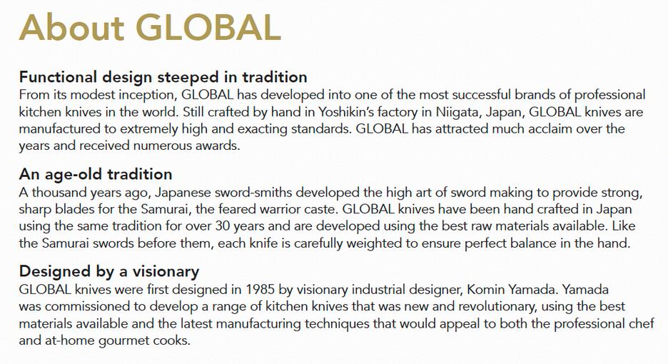 GLOBAL knives were first designed in 1985 by visionary industrial designer, Komin Yamada. He was commissioned to develop a range of kitchen knives that was new and revolutionary, using the best materials available and the latest manufacturing techniques that would appeal to both the professional chef and athome gourmet cooks.