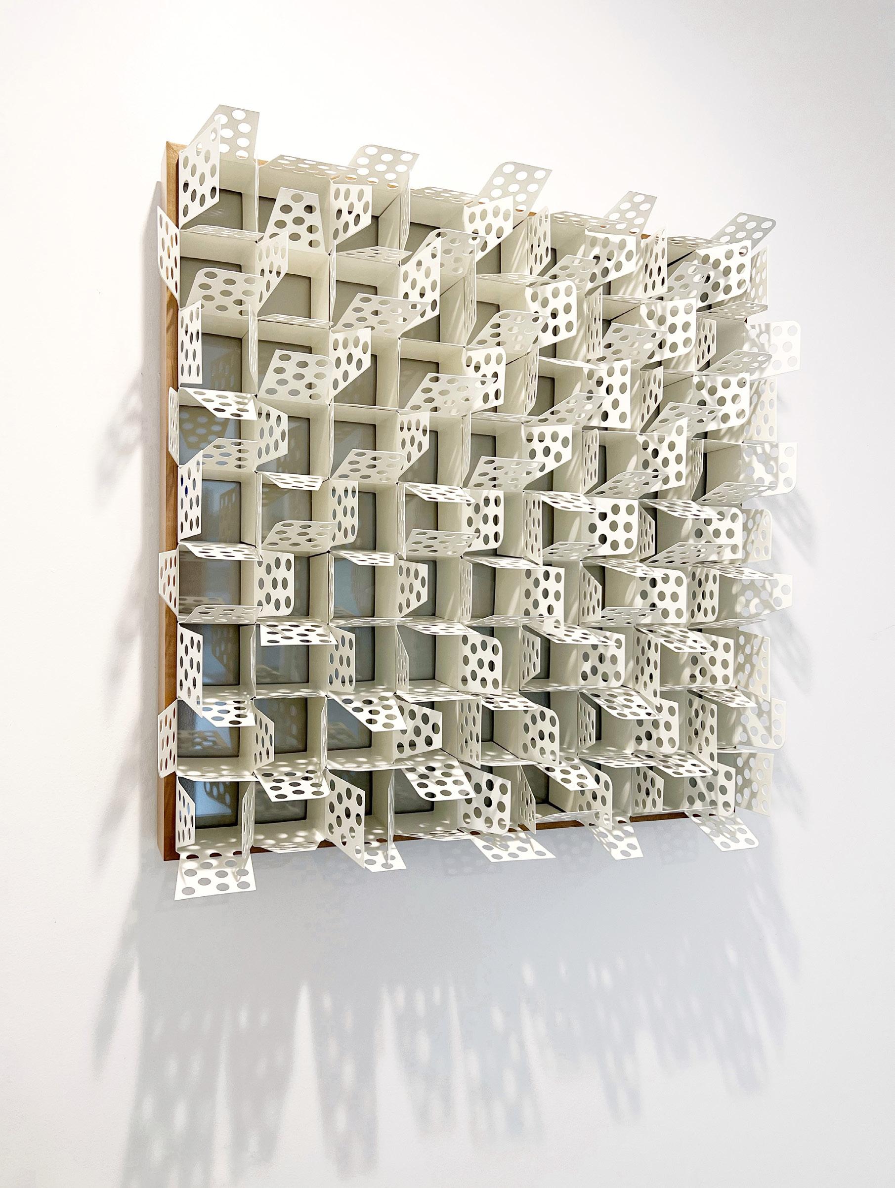 Assembled coffee cup protectors turned inside out transform light into a visual labyrinth.