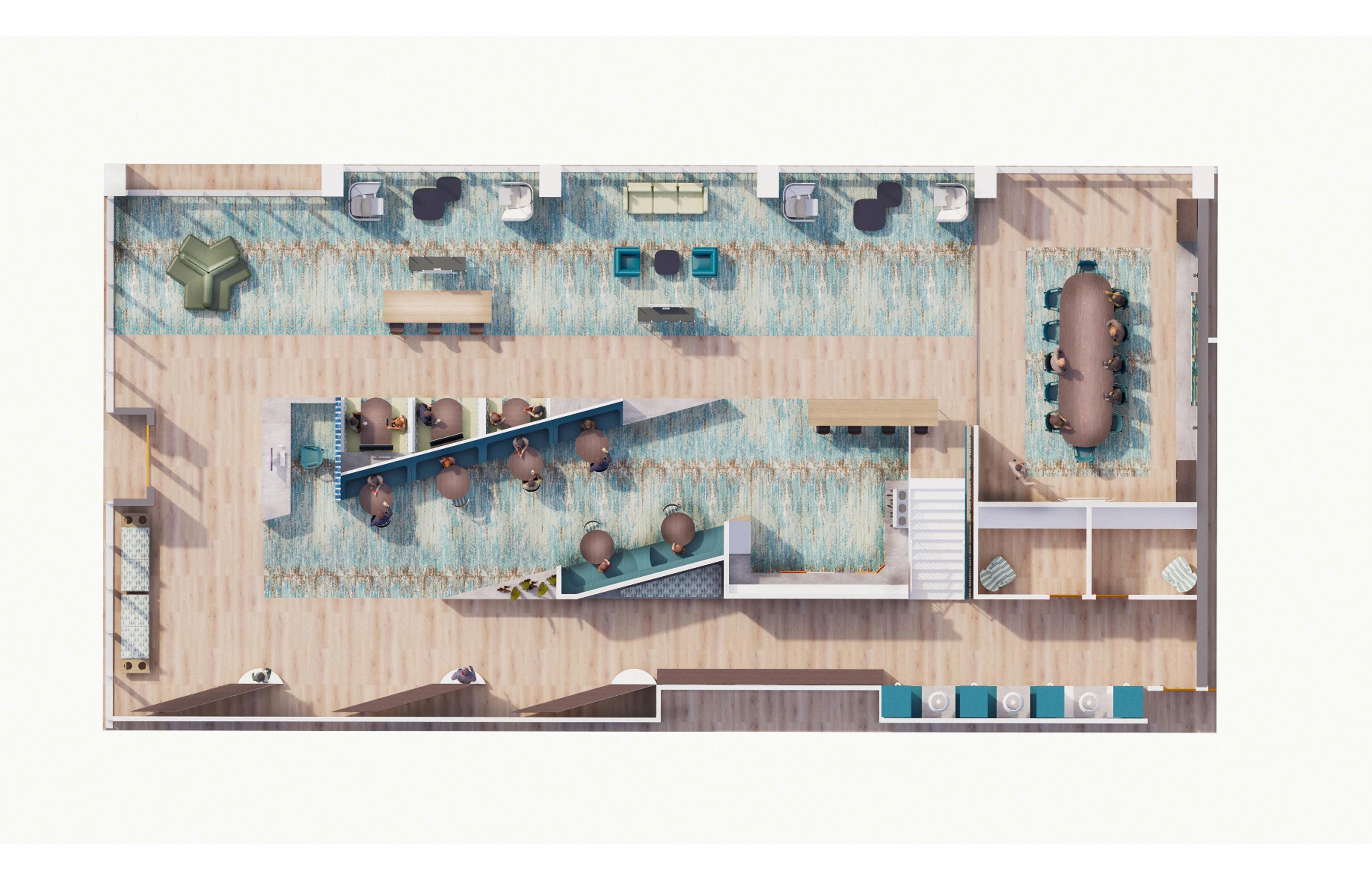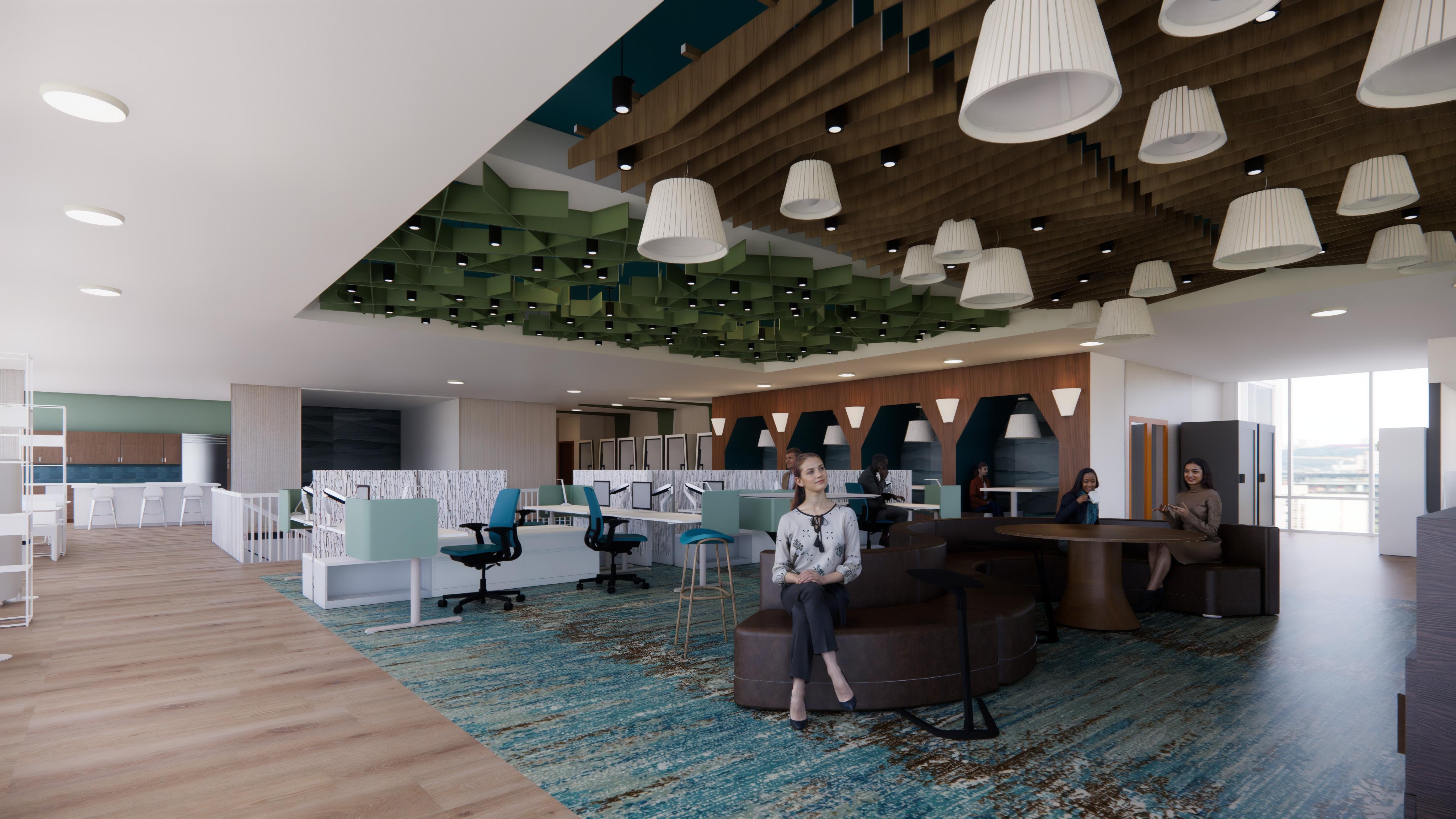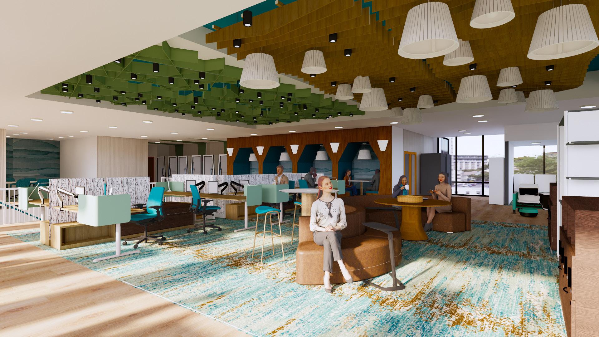 4 Columbia's workplace will accomplish functionality and collaboration. Addressing the needs of the employees by implementing active areas of rejuvenation. This allows users to consciously, engage in restoring their energy, vitality, and health, rather than relying on passive rest alone. It implies using specific practices to actively replenish oneself, often focusing on mental, physical, or energetic balance. Through spaces such as the fitness center, cafe for meals and beverages or wellness rooms or pods to rejuvenate.