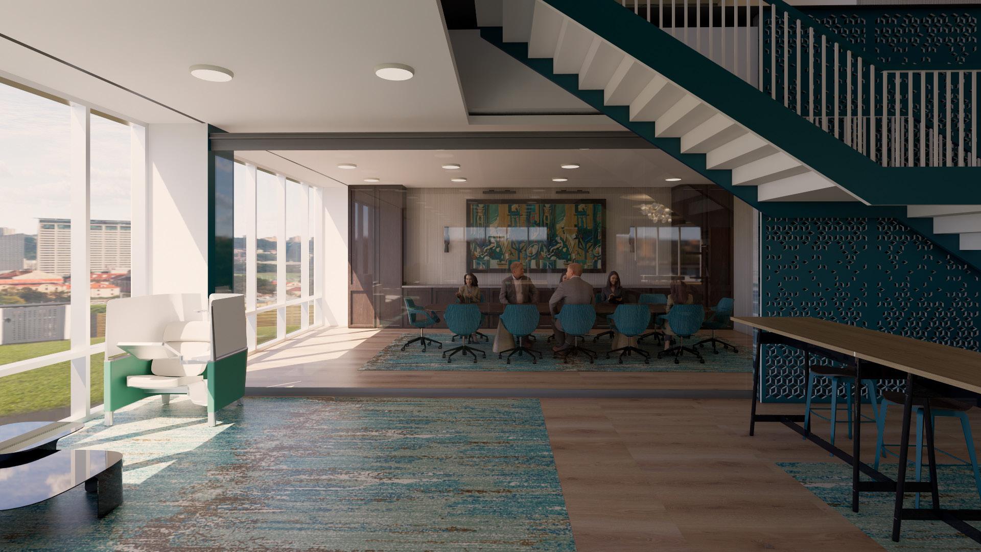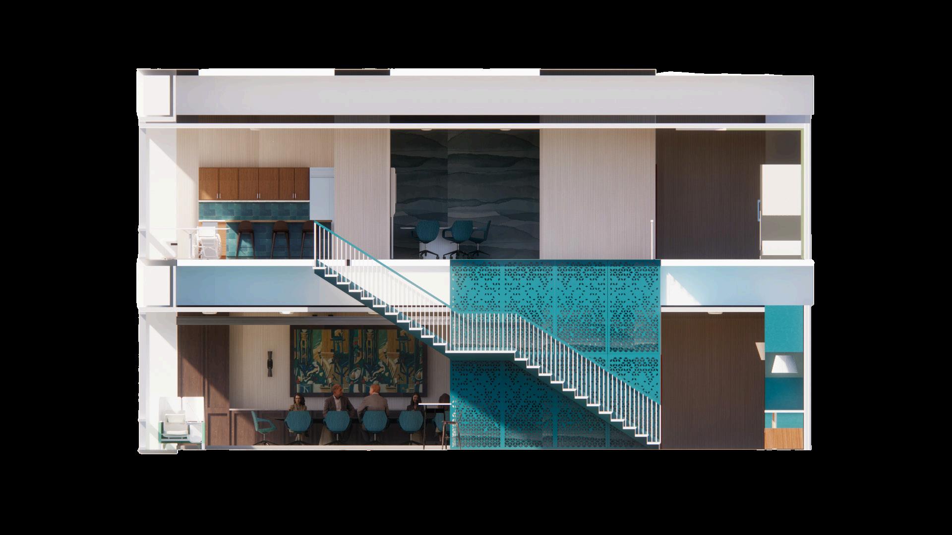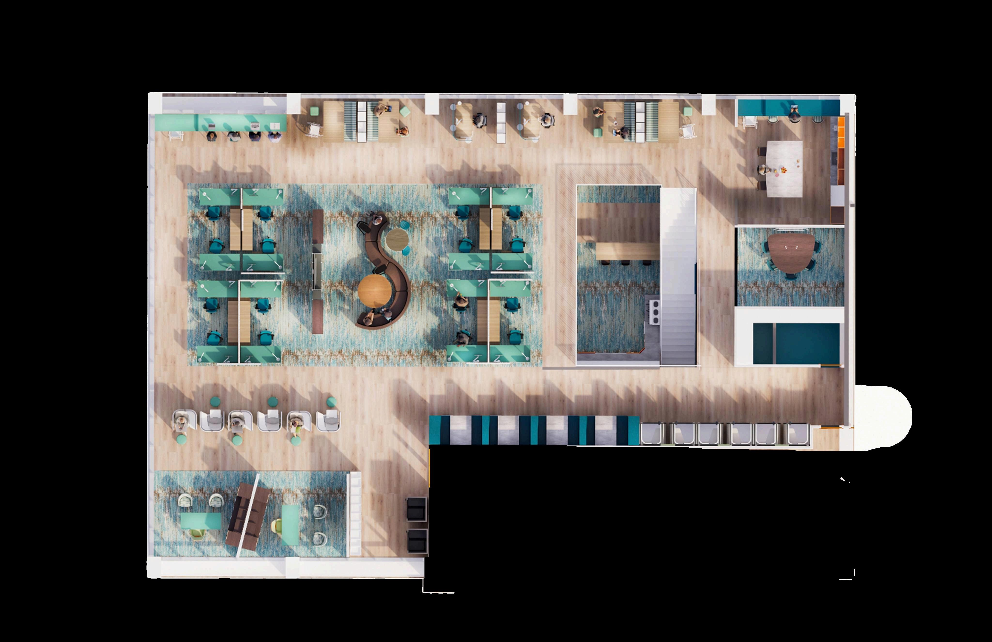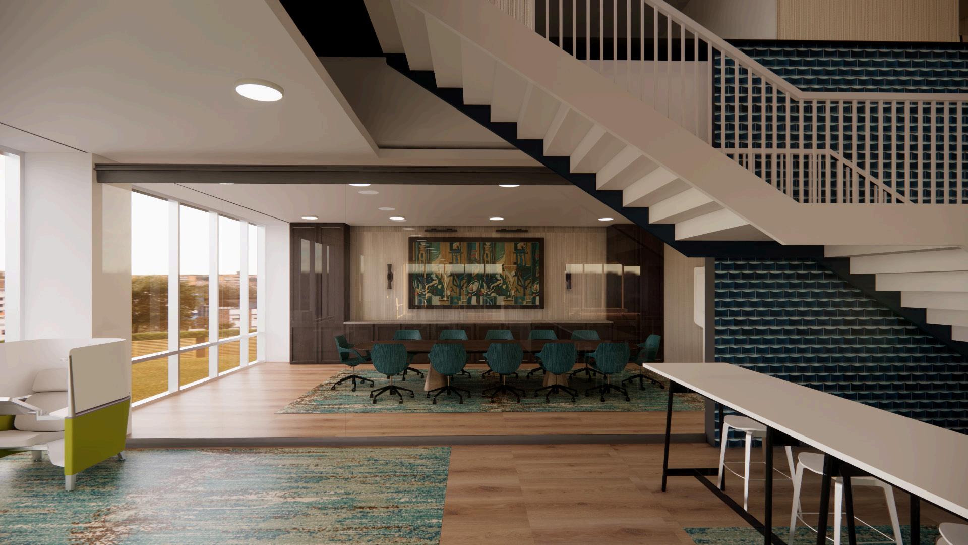 4 Columbia's workplace will accomplish functionality and collaboration. Addressing the needs of the employees by implementing active areas of rejuvenation. This allows users to consciously, engage in restoring their energy, vitality, and health, rather than relying on passive rest alone. It implies using specific practices to actively replenish oneself, often focusing on mental, physical, or energetic balance. Through spaces such as the fitness center, cafe for meals and beverages or wellness rooms or pods to rejuvenate.