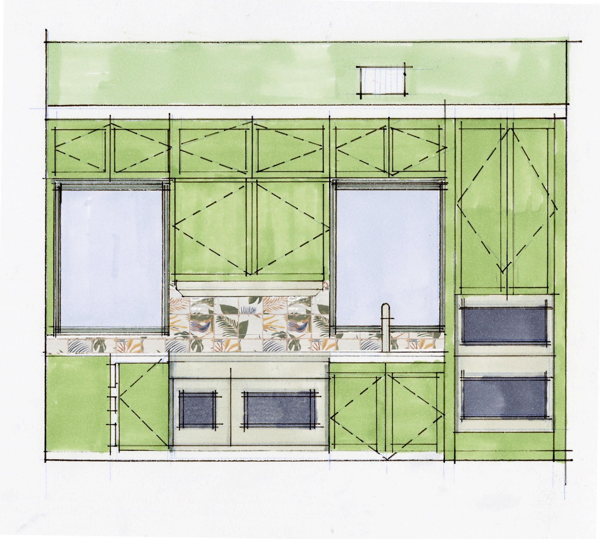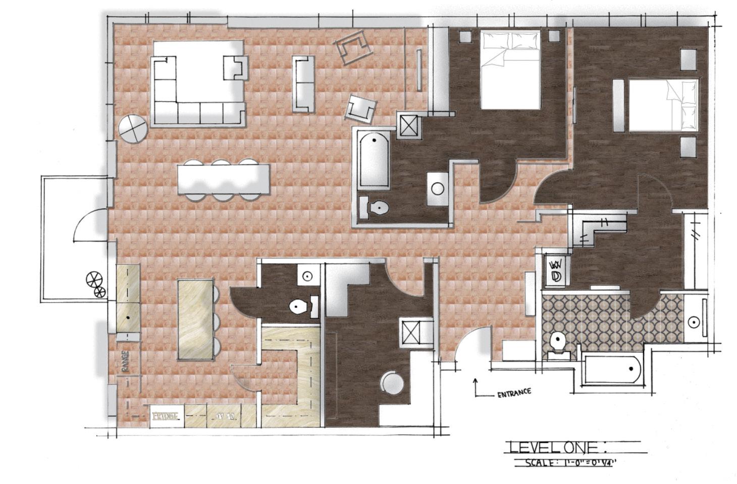 The floor plan provides the clients with a private bedrooms and hosting kitchen and living space. A