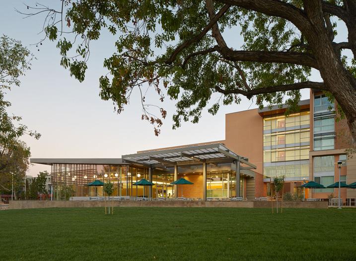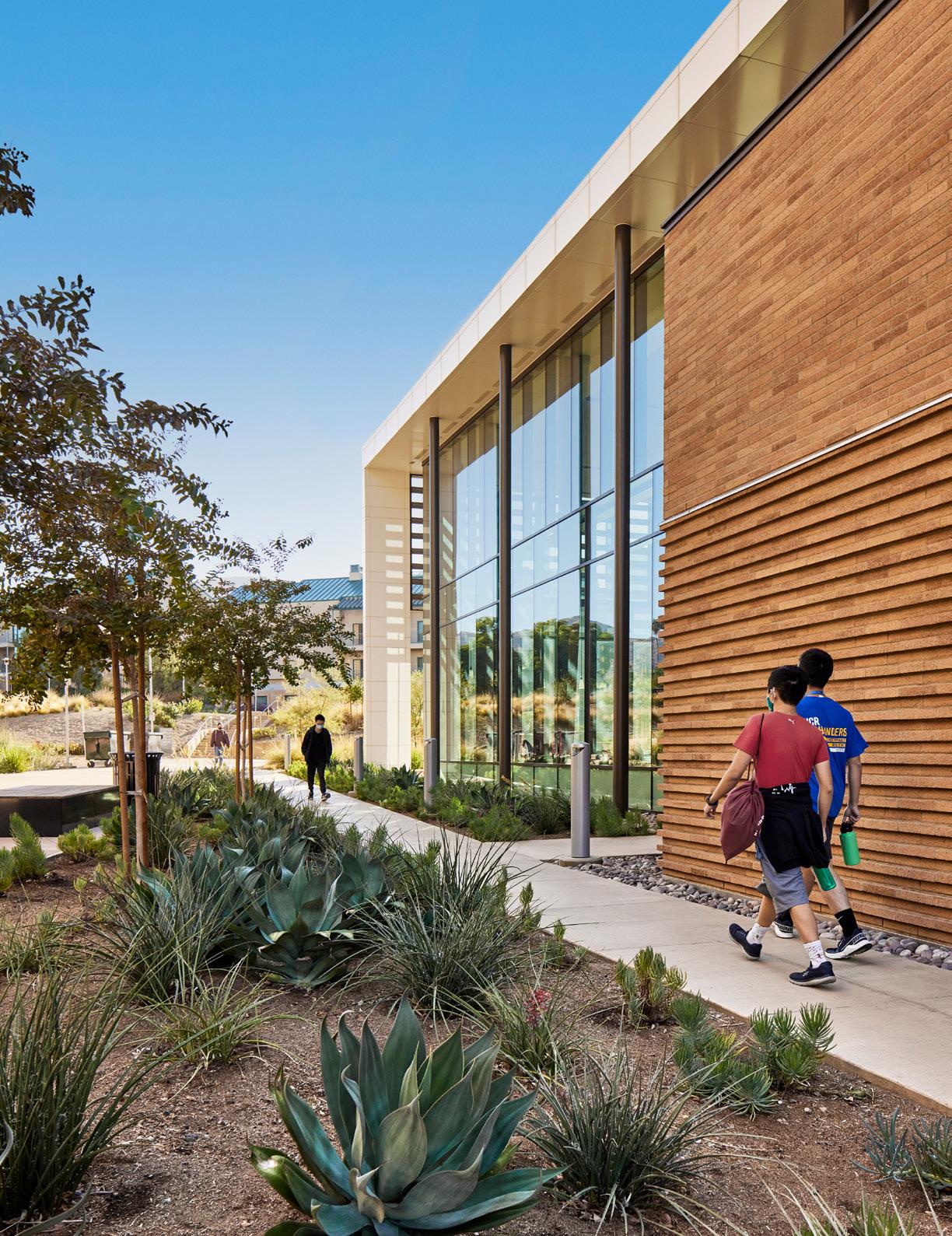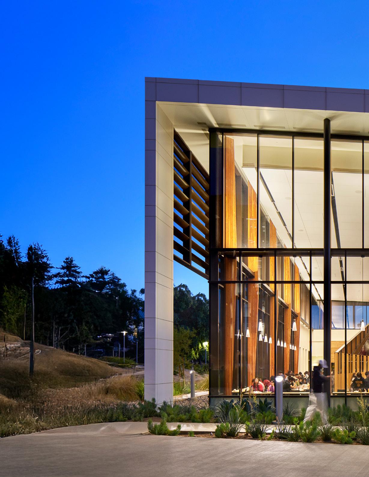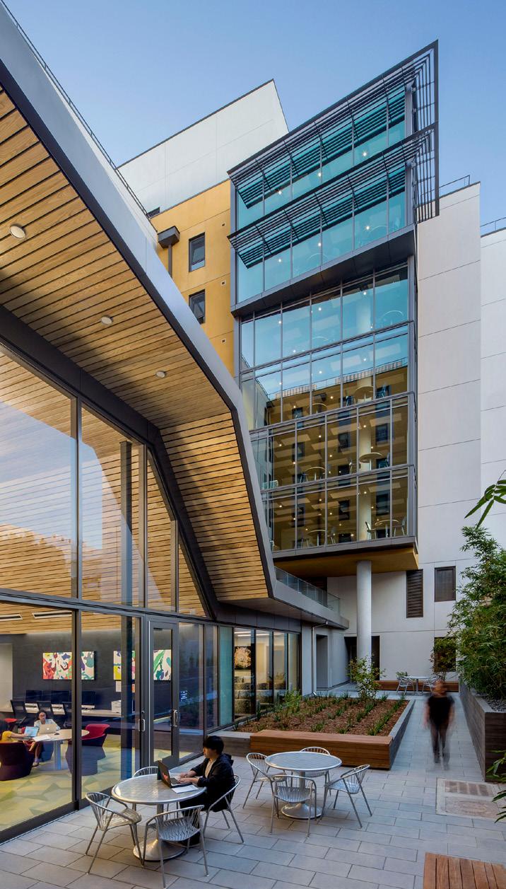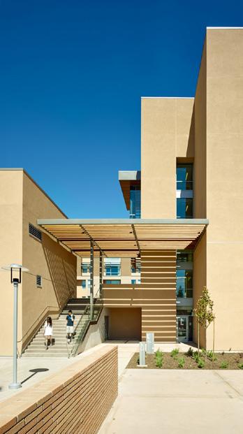 The building’s character incorporates sustainable strategies in response to the environmental influences with particular attention given to mitigating sun and wind exposures. An exterior covered walkway along the southeast façade of the building is deep enough to fully shade the classroom and lecture halls from direct solar heat gain. Southwest-facing glass is protected through a layered façade, with 24-inch deep horizontal and vertical shades mitigating afternoon and early evening sun. Windows for offices facing northwest are shielded by vertical fins, minimizing direct solar heat gain in the late afternoon. These strategies, combined with a robust thermal envelope and utilization of campus plantgenerated utilities, are projected to result in 33 percent energy savings below California Title 24 requirements. The building is LEED Platinum, contributing to the University’s Triple Net-Zero Commitment.
