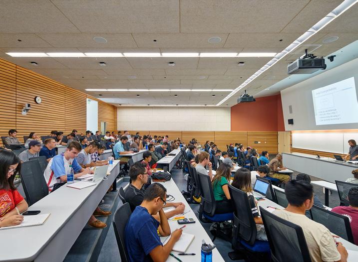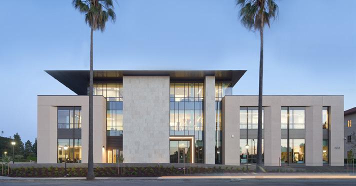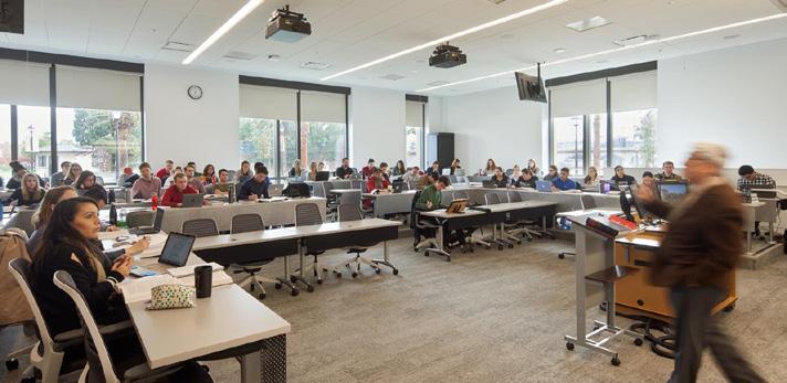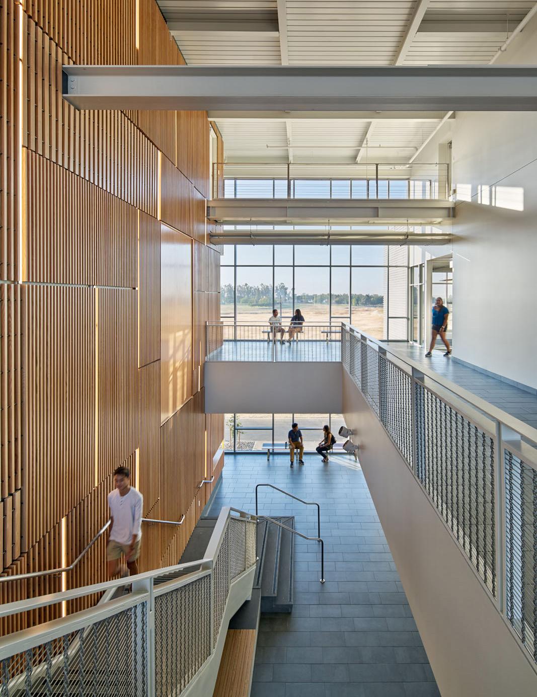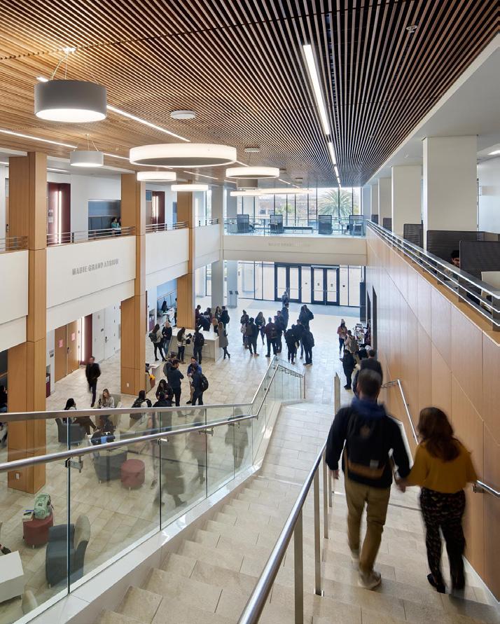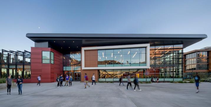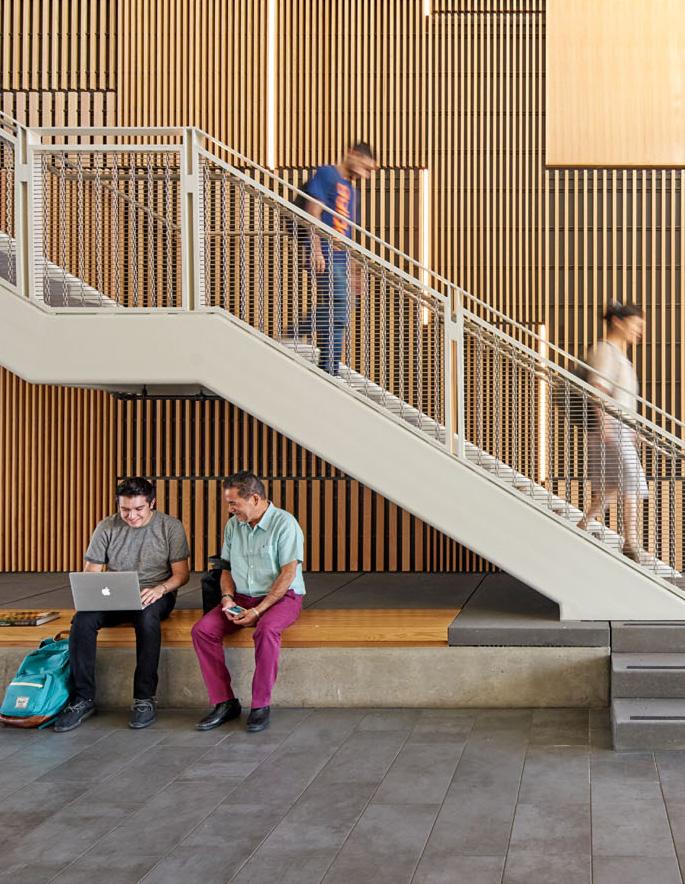 The building’s character incorporates sustainable strategies in response to the environmental influences with particular attention given to mitigating sun and wind exposures. An exterior covered walkway along the southeast façade of the building is deep enough to fully shade the classroom and lecture halls from direct solar heat gain. Southwest-facing glass is protected through a layered façade, with 24-inch deep horizontal and vertical shades mitigating afternoon and early evening sun. Windows for offices facing northwest are shielded by vertical fins, minimizing direct solar heat gain in the late afternoon. These strategies, combined with a robust thermal envelope and utilization of campus plantgenerated utilities, are projected to result in 33 percent energy savings below California Title 24 requirements. The building is LEED Platinum, contributing to the University’s Triple Net-Zero Commitment.