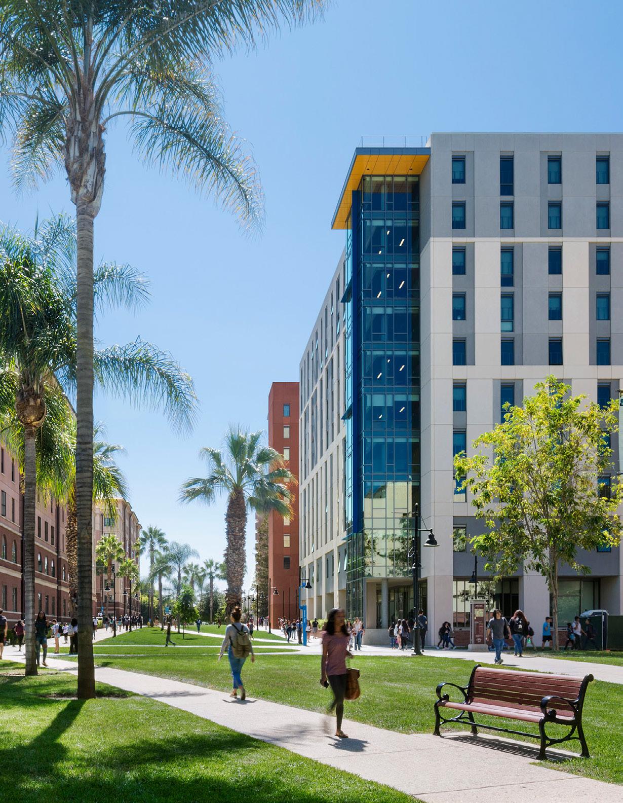 Phase One of the project is a 1,500-bed upper-division undergraduate apartment community at the terminus of Aberdeen Street onto Linden Street, both major campus thoroughfares. The project is organized into six massings fronting a large, open paseo that visually extends the Aberdeen Mall as a pedestrian-only public space with various gathering areas. The paseo is activated by the diverse program elements of the ground floors of the buildings which include classrooms, a small café, fitness center, resident study and social lounges, and the leasing and residence life office.
