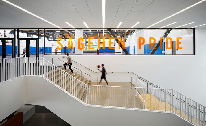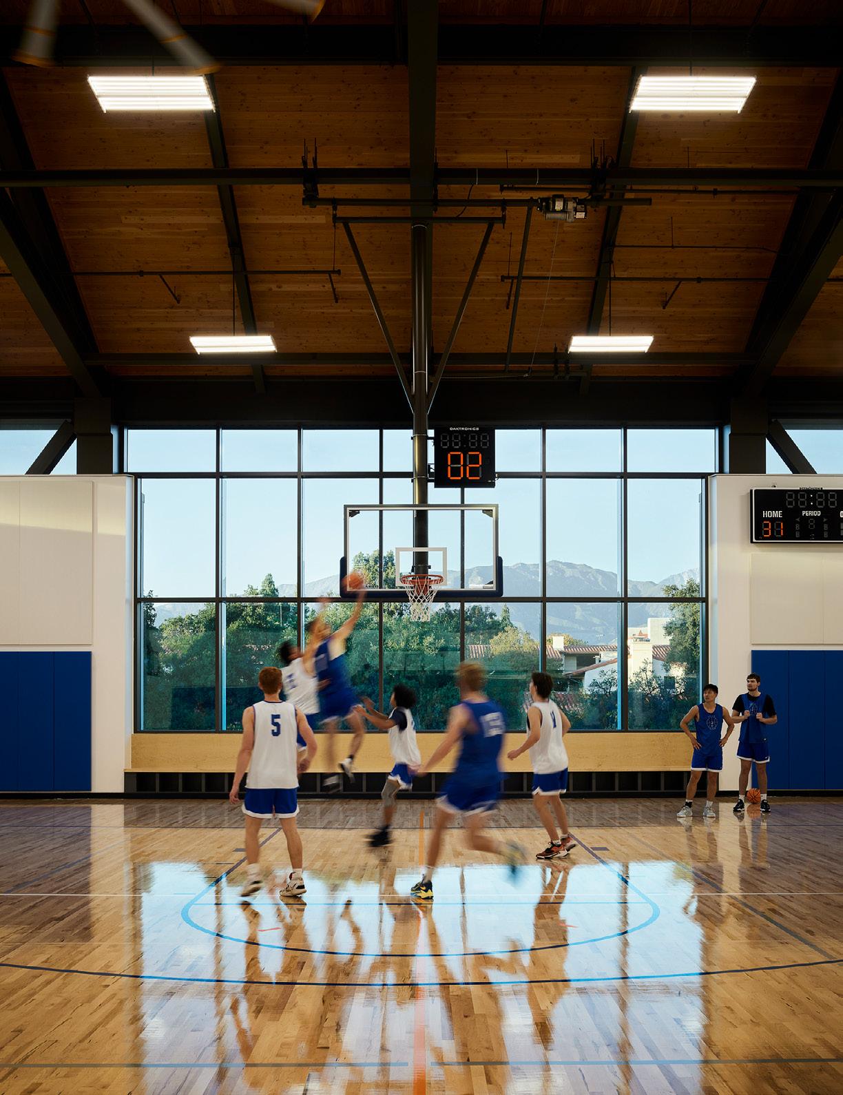At the heart of the Center is a student commons, which features a terraced stair and seating areas within a skylit doubleheight volume. Recreational and wellness program offerings are transparently organized around the commons, inviting participation and conveying activity. A new recreational gymnasium located on the second level affords natural daylighting and features prominent views of the San Gabriel mountains through a dramatic glass backdrop. The gymnasium’s structure is composed of cross-laminated timber supported by steel trusses.