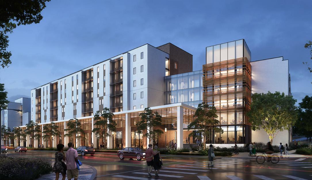 An activated ground floor provides student residents with a variety of amenities and administrative services including social and recreation spaces, a fitness center, a grab and go café, centralized laundry facilities, and academic-focused spaces for both group and individual study. Many of the spaces connect seamlessly to two, large, terraced courtyards that serve as tranquil respites and hubs of social interaction for residents.