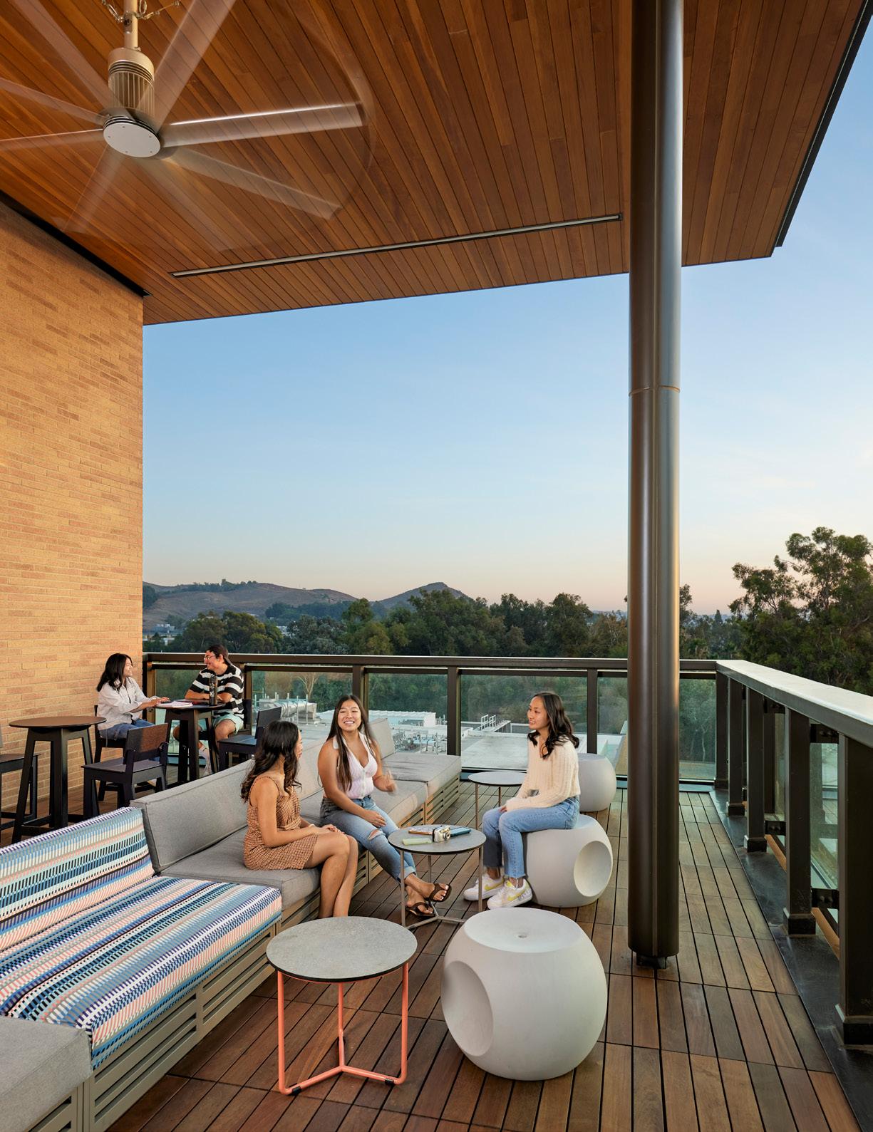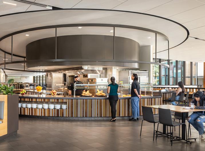 At the courtyard’s southern reach, a large portal through Dundee South Hall reveals the 800+-seat Glasgow Dining Commons, the residential precinct’s signature building. Sweeping walls of glazed curtain wall are shrouded within a louvered shell, allowing for dramatic views of the surrounding Box Spring Mountains, while mitigating solar gain and glare. The 52,000 square-foot all-youcare-to-eat facility offers six unique food venues, including a central demonstration kitchen and exhibition bakery, as well as a grab-and-go convenience store. An elevated outdoor dining terrace provides additional seating, taking advantage of the campus’ hospitable climate, year-round. Glasgow Commons is LEED Silver.