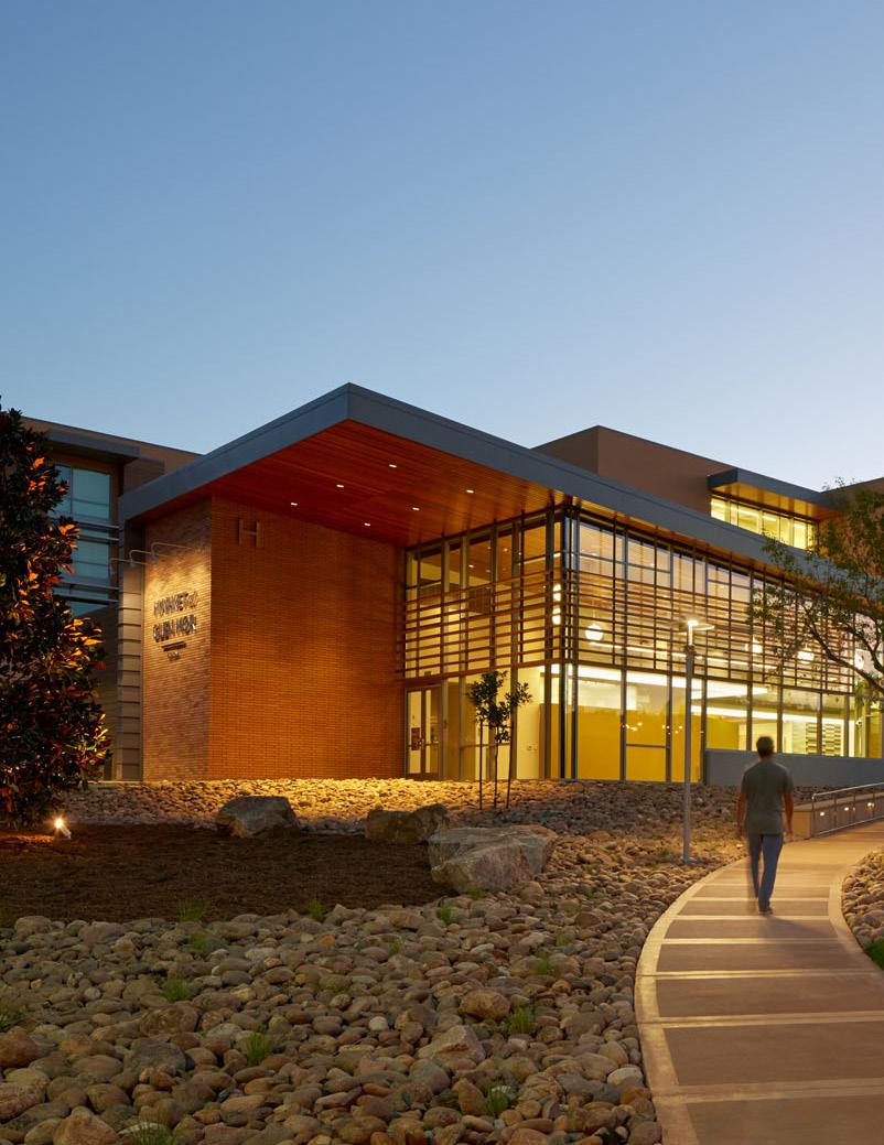 The dynamic, angular roof of the Commons is inspired by the region’s topography and allows for daylight to reach deep into the building’s interiors. Exterior materials are primarily terracotta-toned cement fiber panels, glass curtainwall, and translucent fiber reinforced polymer panels –emphasizing daylighting and views from both within and into the facility. Passive solar strategies were incorporated to assure that heat gain was mitigated and glare was controlled. The project is LEED Gold certified.