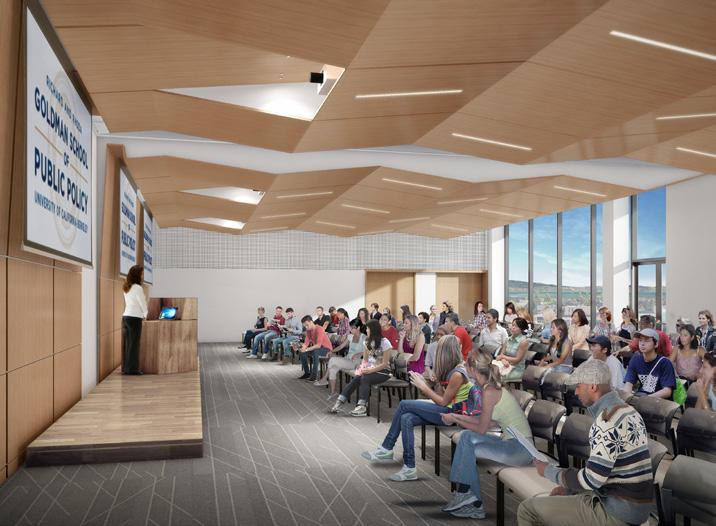 The GSPP is a 36,000-square-foot, five-story facility designed to support the School’s innovative educational program and collaborative community spirit. Its prominent placement along Hearst Avenue establishes an visible identity for the School and a new entry to the GSPP quad. Major program elements are made visible through liberal use of glass, while the building’s more solid masses, clad in cedar siding and board-formed concrete, respond to the scale and materiality of the surrounding context. The building’s program includes a 250-seat divisible classroom, seminar classrooms, faculty and shared graduate student offices, all centered around a living room. The living room is a three-story atrium overlooking a new outdoor plaza that serves as a central gathering space for the Goldman School. The atrium’s ceiling will be glazed with an integrated photovoltaic array, providing both glare control and energy generation. An elegant stair punctuates the atrium, while a cafe further activates the space. The top level of the building boasts a roof deck with views of the Bay and Golden Gate Bridge.