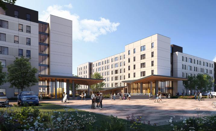THE EXTERIOR DESIGN FOR THE NEW RESIDENCE HALL COMPLEMENTS THE EXISTING NORTH HOUSING VILLAGE IN ITS SCALE, COLOR, MASSING, AND LANDSCAPE.