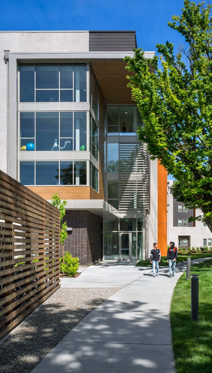 The new community is located on the edge of campus along the American River; as such, SCB oriented the building to maximize views of the river. Shared study rooms, a two-story fitness center, recreation areas, and social lounges are prominently located on corners of the facility with floor-to-ceiling glass to enhance river views. The entire development radiates from a dynamic outdoor courtyard, activated by a series of classrooms and multi-purpose rooms, as well as new administrative offices for University Housing Services. A large gateway through the building connects the major pathway from campus to the courtyard, providing access to the river for the greater campus community.