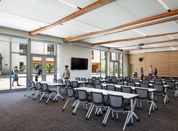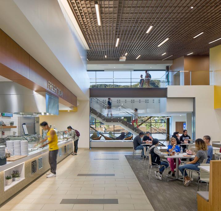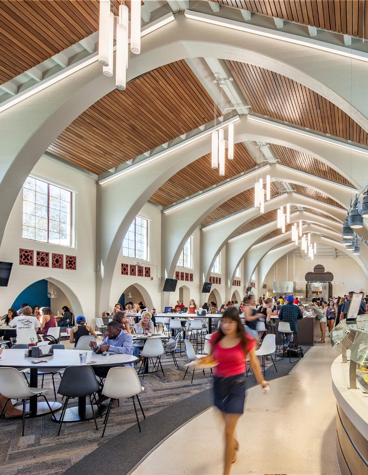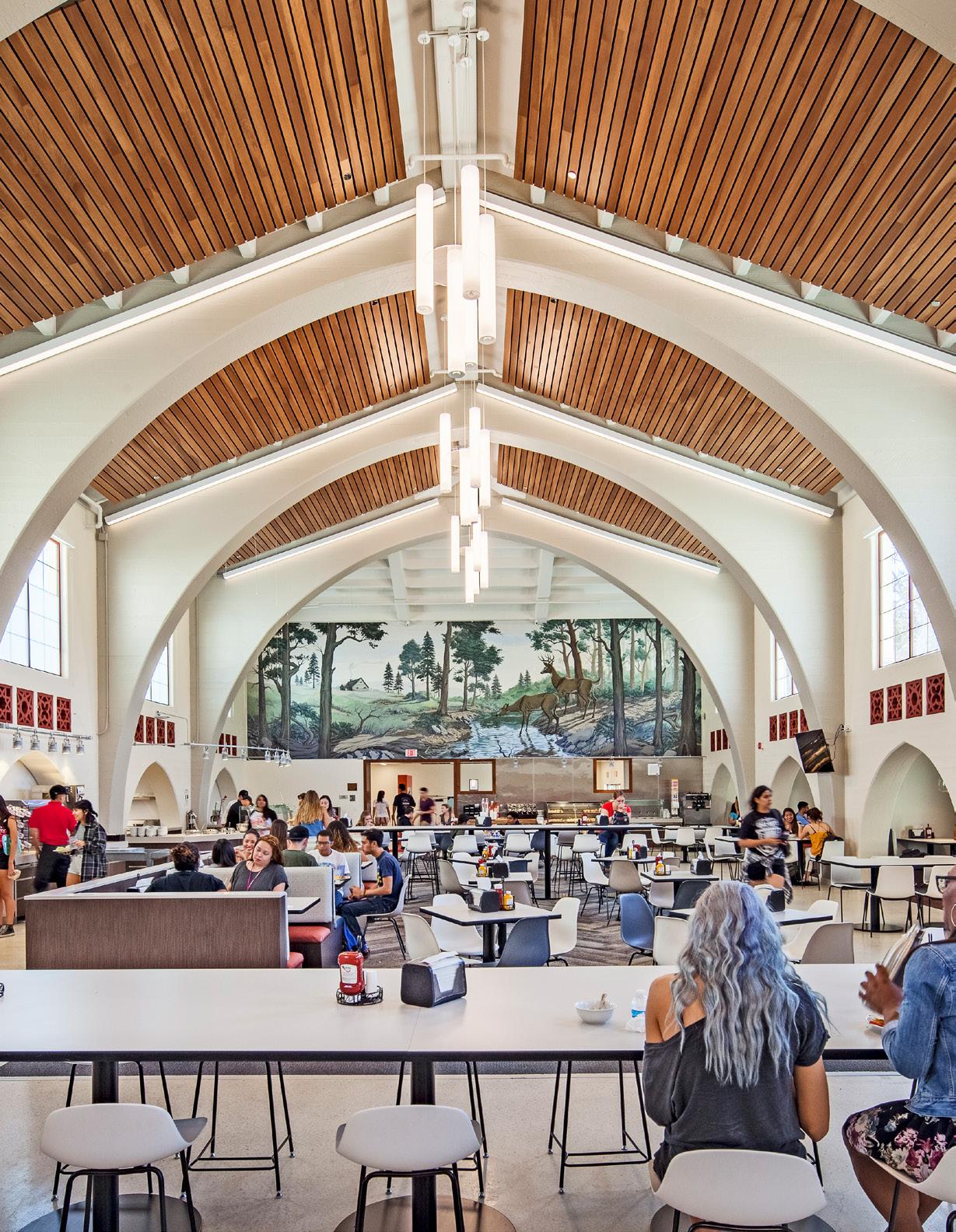 Constructed in the 1930’s, Islands Café was originally composed of two separate men’s and women’s mess halls. SCB led the renovation of the 14,000-square-foot men’s hall and designed an addition to link the two structures, creating a single, all-you-careto-eat dining hall. The 1,700-square-foot addition houses a new single point-of-sale entry to both dining halls, a shared dish return, and expansion to the main kitchen. Additionally, a new outdoor seating patio was constructed, fronting the south campus quad to the west. The extensive renovation also included a full building systems replacement and upgrade.