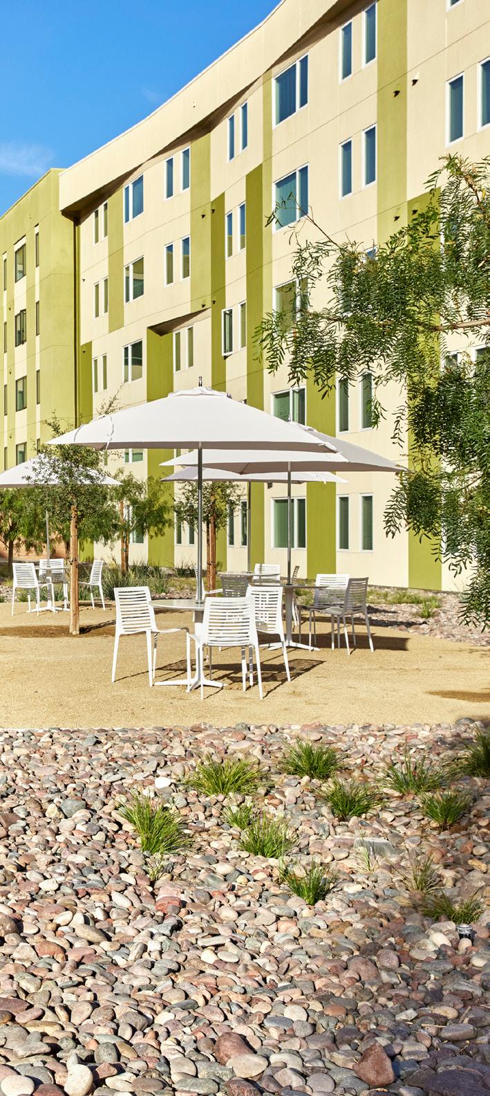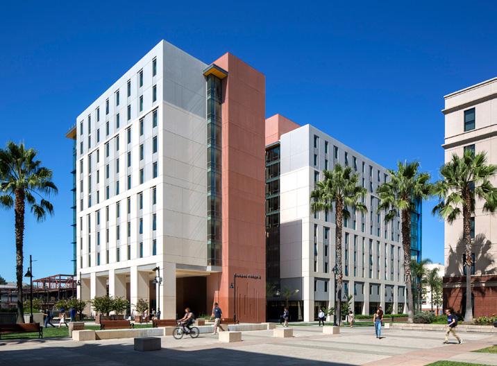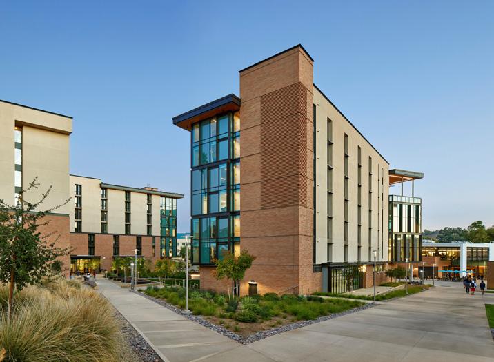 Dundee Residence Hall and Glasgow Dining Commons are the first of several large-scale projects adding residential capacity and transforming the campus experience at UC Riverside. Located adjacent to the campus’ original residence halls, Aberdeen-Inverness (A&I), the 820bed Dundee Residence Hall complements the geometry of A&I, utilizing two sevenstory buildings to form a shared outdoor courtyard. The courtyard serves as the “living room” of the community, offering a variety of recreational and social, as well as contemplative spaces, amidst a landscape of native plantings.