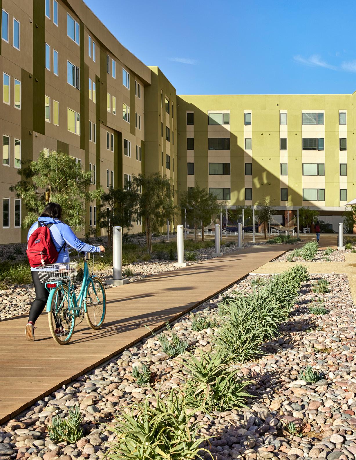 The project is all-electric; the first student housing project to be so on campus. Extensive shading studies informed the siting of the buildings to facilitate selfshading of the facades and courtyards over the course of the day. Water usage by occupants is reduced through low-flow plumbing fixtures. Outside, a landscape of drought tolerant and native plantings is minimally maintained by an efficient lowwater irrigation system.