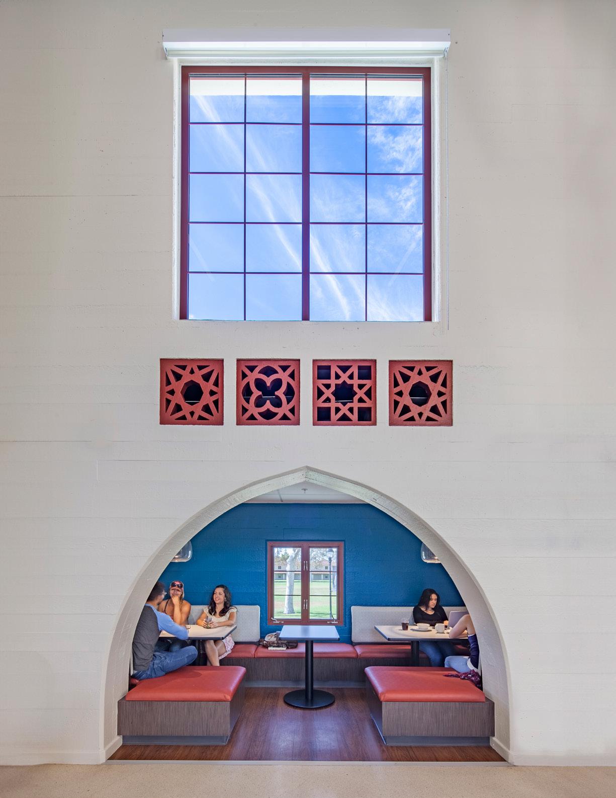 The SCB design team sought to accentuate the character of the historic California mission style architecture through the addition of wood infill ceiling panels, highlighting existing decorative accents, and providing a complete exterior refresh with new windows, roofing and outdoor trellis. The layout of the 230-seat dining hall features a variety of seating types in the main salon of the building, surrounded by six new food venues and intimate banquet seating located in the existing side aisle niches. An additional 182 seats are located on the new outdoor patio. The new seating, furniture, and fixtures complement the architecture and modernize the space.