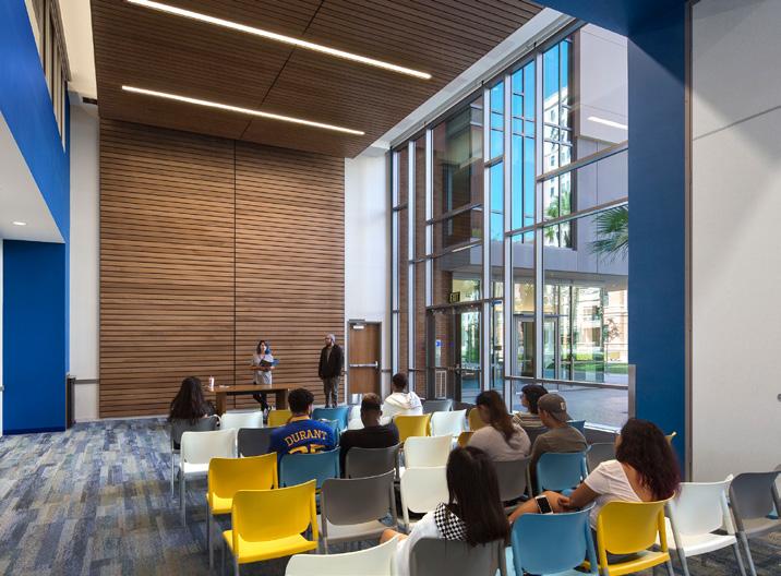 Charney Hall includes a 230-seat lecture hall that can be divided into two 115-seat lecture halls as well as several different mock court layouts. The building also features a 1,700-square-foot collaborative learning classroom. A new law library includes 4,300 square feet of stacks and a large reading room with new technologybased research capabilities. A legal clinic provides hands-on experience to law students and services clients and the community. Study spaces and 53 faculty and administrative offices are located throughout the building.