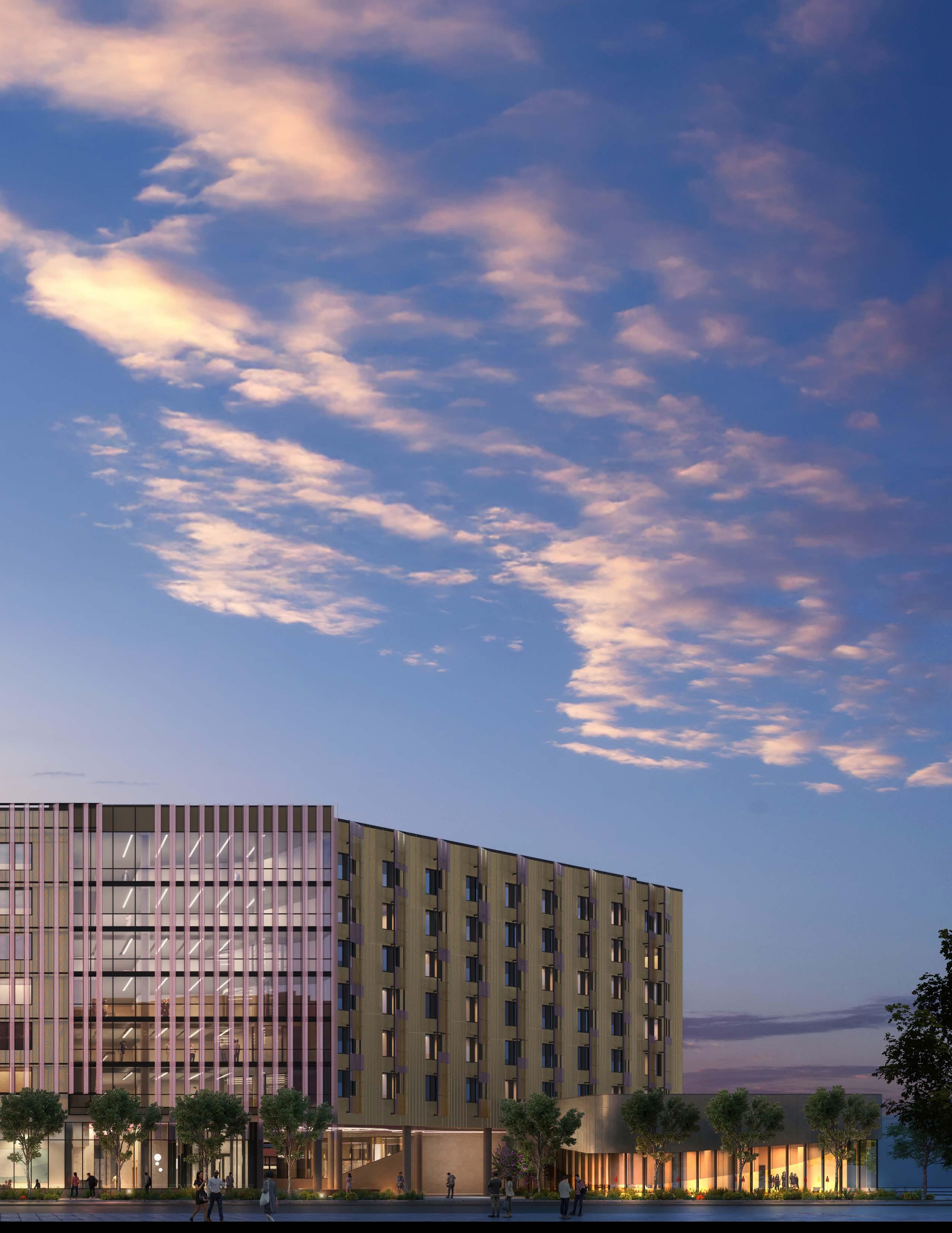 The massing of the buildings combines a strong urban edge with a large campusfacing portal leading to an internal activated plaza, which serves as a central nexus for the mixed-use program. A dynamic lilac ceiling plane weaves together the various outdoor and indoor program elements, creating a fluid and engaging user experience through the site and buildings.