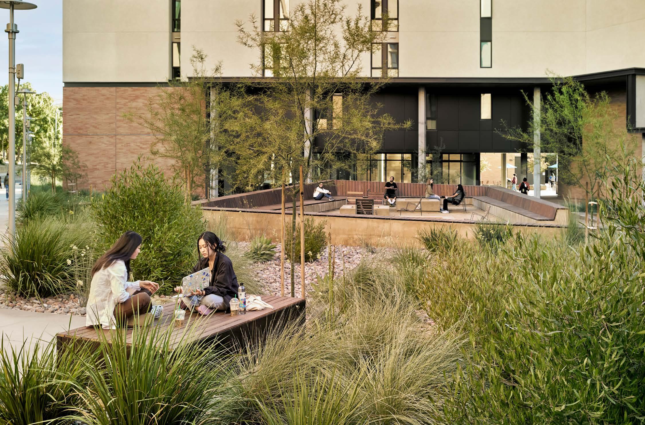 The geometries of the various buildings create three character-defining outdoor courtyards, befitting the region’s high desert climate. The southeast courtyard offers a quieter environment for study and rest and is noted by a multitude of hammocks. The northeast courtyard is a mostly green space centered on a terraced grass berm. The western courtyard, the largest of the three, offers shaded seating areas and a recreation lawn, along with access to the fitness center.