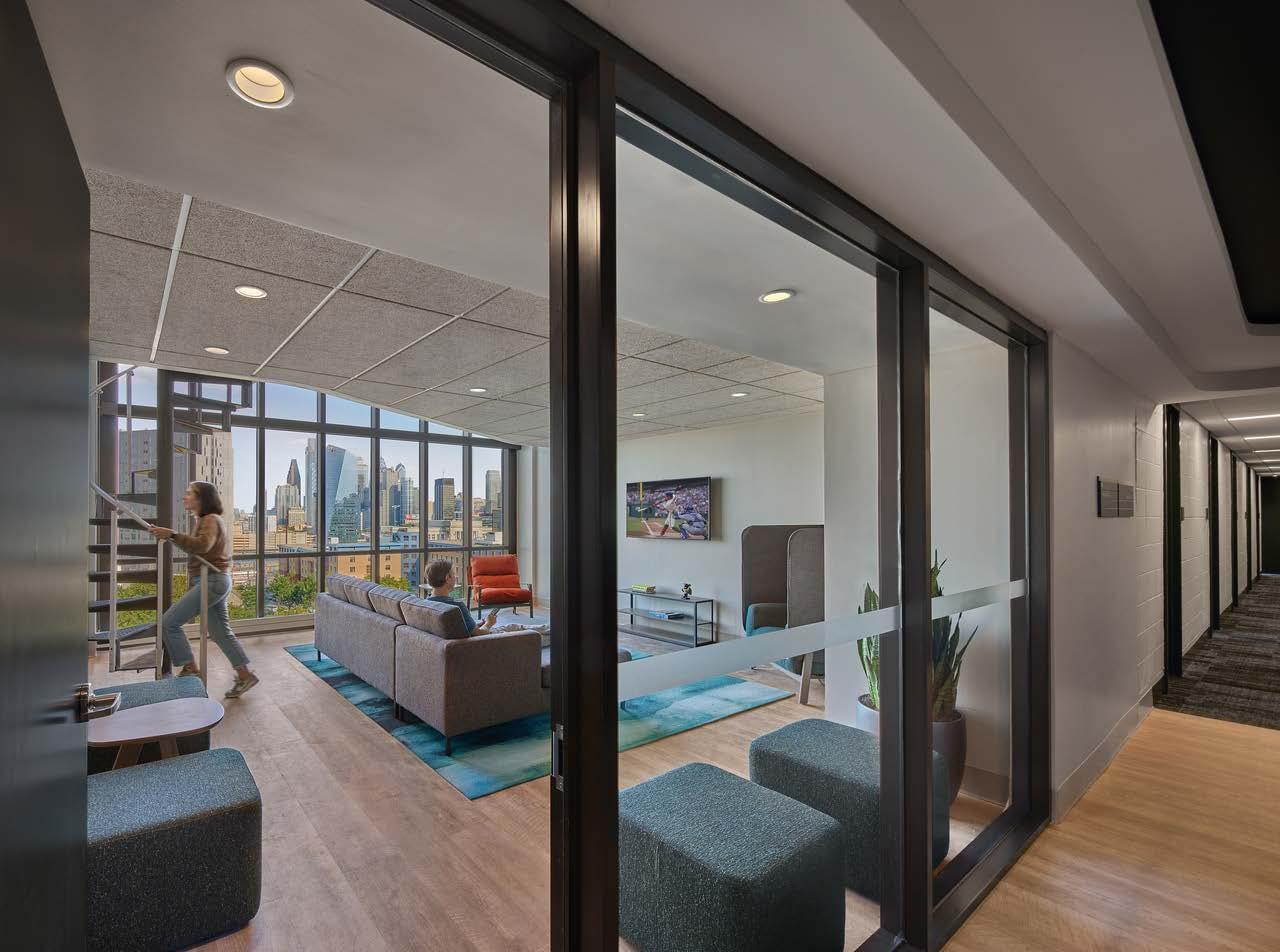 Inside, minimal alterations were made to the residential floorplans; the 410 beds were maintained as traditional doubleoccupancy rooms, while the existing shared community bathrooms were updated to offer private shower and toilet stalls. The residential floors are linked through a series of central, twostory social lounges. Here, the design team took the opportunity to celebrate these communal spaces by replacing the masonry façade with a glass curtainwall, as well as opening visual access to the lounges from the interior through the use of glazing, allowing daylight into the primary circulation path on each floor.