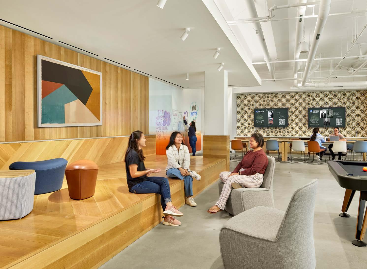 Floor-to-ceiling glazing visually connects the two courtyards through the amenity space, blurring the lines between the indoors and outdoors. Amenities include indoor and outdoor kitchens, social and study lounges, private study rooms, and a fitness center. Residential floor study lounges stack the full height of the building at the entry plaza, their glowing light and bold wall graphics becoming a visual marker for the community and Discovery Park District as a whole.
