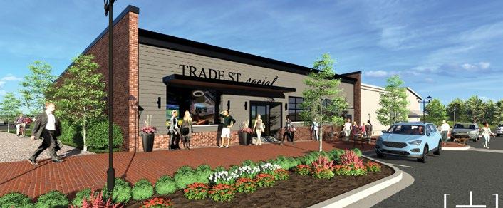 Trade Street Social will focus on entertainment, featuring arcade games, virtual golf and racing simulators, bowling, with a full bar and food menu, patio seating and roll-up doors at the front of the building.