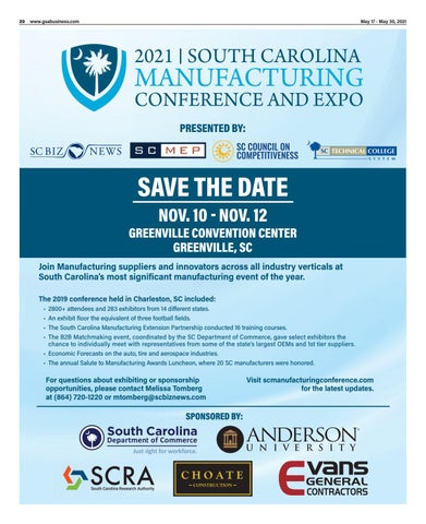 GREENVILLE CONVENTION CENTER GREENVILLE, SC Join Manufacturing suppliers and innovators across all industry verticals at South Carolina’s most significant manufacturing event of the year. The 2019 conference held in Charleston, SC included: • • • •