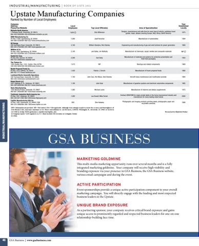 INP = Information not provided. NR = Not ranked. N/A = Not applicable. Although every attempt is made to ensure the accuracy and thoroughness of GSA Business lists, omissions sometimes occur. Please send additions to: List Research, 1204B E. Washington St., Greenville, SC 29601 or via fax to 235-4868 or at http://www.gsabusiness.com/directory/update_lists. B Company reports 7,628 employees in S.C. which includes two locations in Lexington County. C 1900s