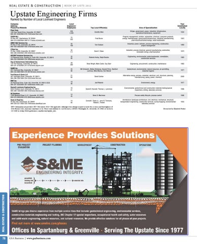 INP = Information not provided. NR = Not ranked. N/A = Not applicable. Although every attempt is made to ensure the accuracy and thoroughness of GSA Business lists, omissions sometimes occur. Please send additions to: List Research, 1204B E. Washington St., Greenville, SC 29601 or via fax to 235-4868 or at http://www.gsabusiness.com/directory/update_lists.