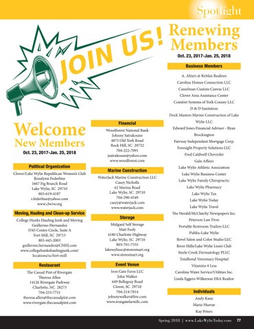 Welcome New Members Oct. 23, 2017-Jan. 25, 2018 Political Organization Clover/Lake Wylie Republican Women’s Club Rozalynn Federline 1667 Fig Branch Road Lake Wylie, SC 29710 803-619-4187 r.federline@yahoo.com www.clwrw.org