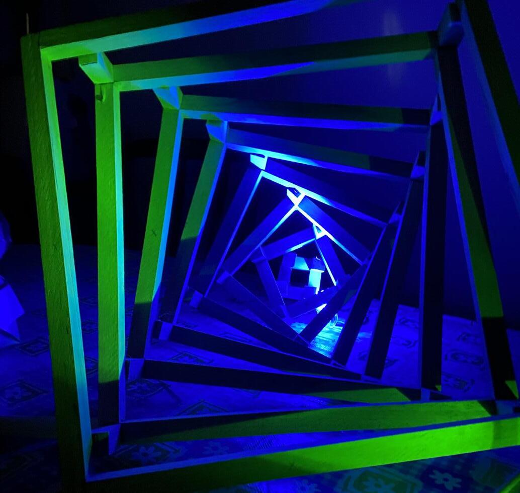 在反覆思索這個問題後,我想做一個跟心靈構成對比強烈 的裝置。以三角形的外型為基礎,用四方形層層堆疊向上 旋轉的塔,來嘗試表達我努力精進的毅力。