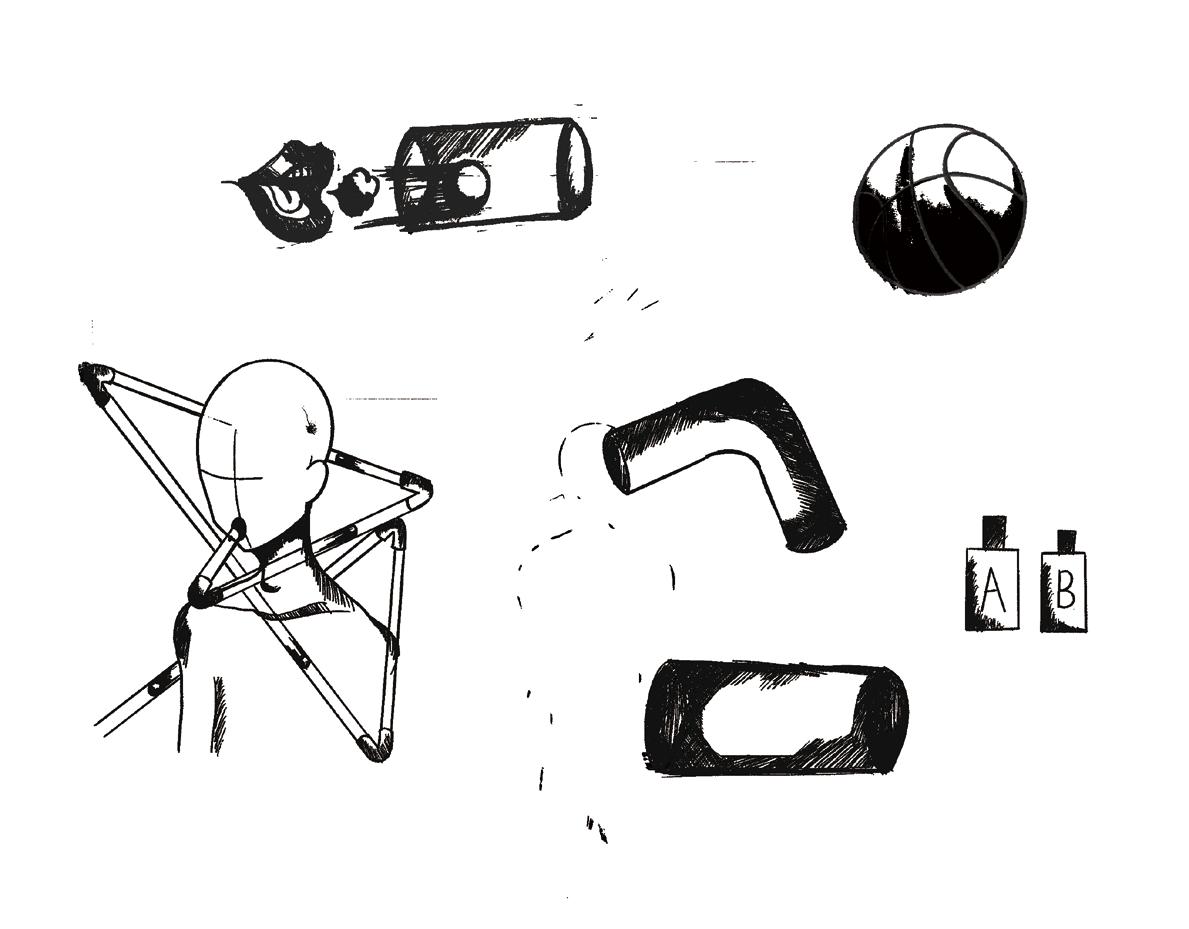 將原已用手腳發力的方式改變成吹氣去 做為動力使球在管中隨意的滾動,肺活 量是這件作品很大的關鍵。而我設計了 三道出口,以自己肺活量的大小控制球 要從哪個地方噴出。