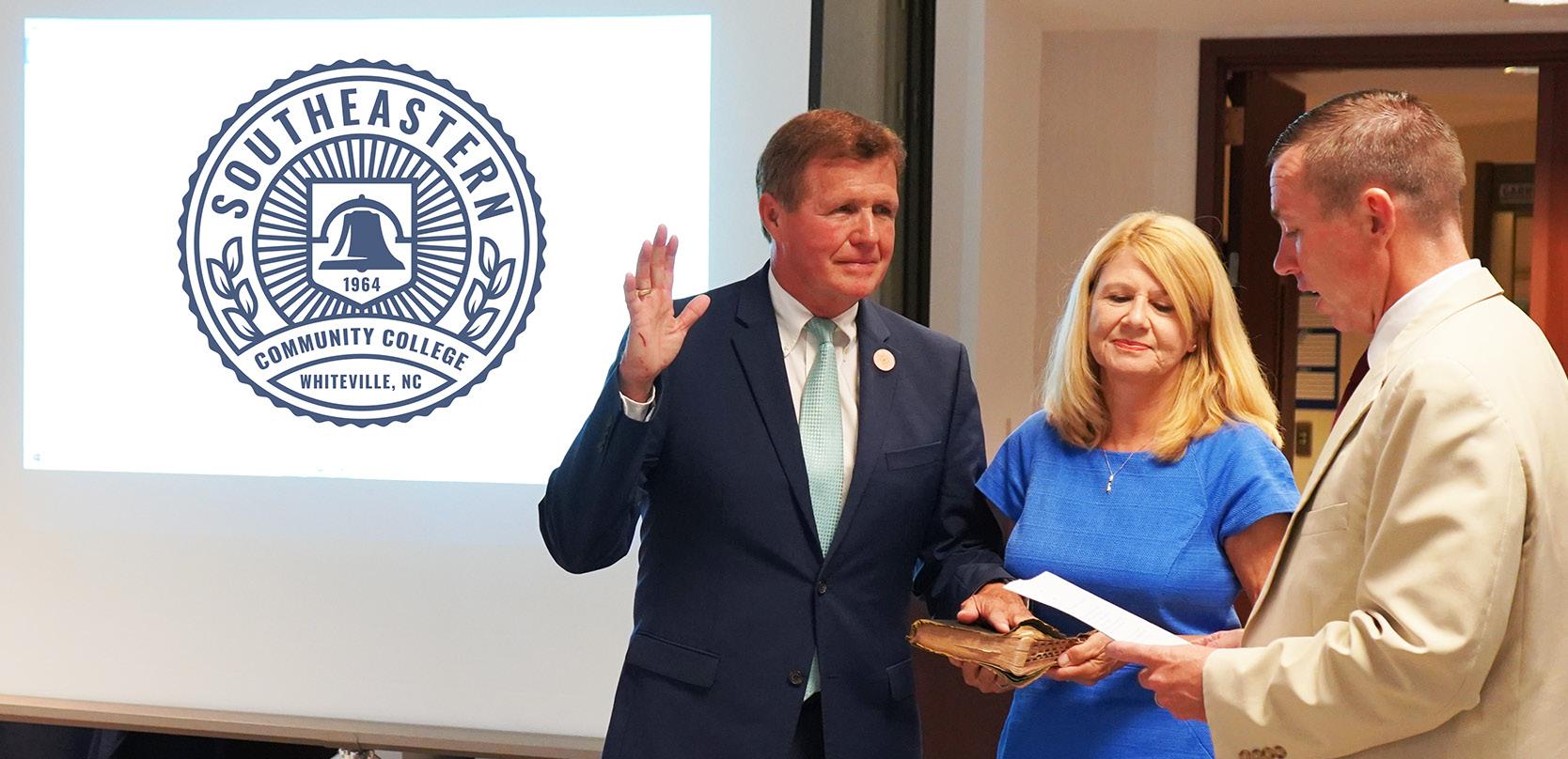 Dr. Dan Strickland being sworn into the SCC BOT by Clerk of Court, Jess Hill