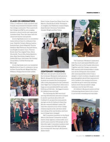 CENTENARY WEEKEND P&F were very proud to be involved in the Centenary Weekend celebrations in March. Along with Old Girls and senior students we assisted the Development Office with preparations for the Centenary Girls’ Night Out Cocktail Party which was a huge success and attended by just under 1000 proud Old Girls – the biggest reunion St Cuthbert’s has ever had! The following day P&F were busy serving refreshments and were on hand to answer questions about life at St Cuthbert’s to prospective new parents and girls at the St Cuthbert’s Open Day. We also enjoyed talking to many Old Girls who enjoyed a tour of the College, reminiscing about the old times while marvelling at the new facilities and how much things have changed! P&F Committee members on the Black Watch Gala Dinner Committee worked hard to help organise a memorable oncein-100-years event for 500 people on the Saturday night. Committee members had a fun evening at the P&F table ending the evening with dancing to Mr Stewart Allan’s band!