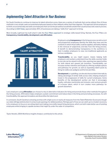 This month’s featured article is about talent attraction Our friends at Lightcast recently published a Talent Attraction Scorecard, which takes into account a number of variables and attempts to determine how states and localities are faring South Carolina came in tenth, with high ratings in most measures From there, the piece pivots toward what individual firms can do to improve the chances that their employees will choose to stay. What Lightcast calls the Four Pillars of strategic skills-based hiring are transparency, transferability, development, and affirmation. Read on to learn more.