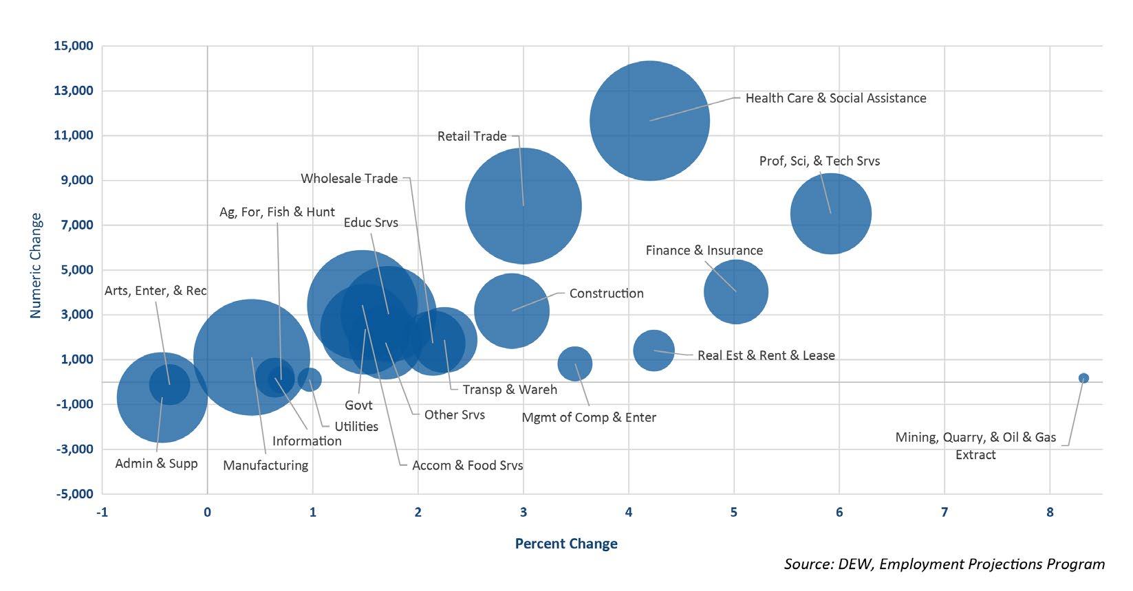 The bubble chart in Figure 3 illustrates the employment projections across various industry sectors with bubble size determined by base employment level and the axes showing the two-year change The Health Care and Social Assistance industry sector is a clear, projected leader .