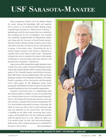 USF Sarasota-M anatee Harry Leopold has shared a lot in his lifetime. During his career, sharing his knowledge, skill, and expertise led to success as an investment banker. Retiring young, Leopold began focusing on a different kind of sharing — philanthropy, which he says has given him more satisfaction than anything else he has accomplished. Now Leopold has created the Leopold Institute for Philanthropic Studies and, along with the University of South Florida SarasotaManatee and the Lifelong Learning Academy, aims to share with others how they can discover the joy and satisfaction of giving. A five-session series, “Discovering the Joy of Giving”, begins in January. Each session is followed by a cocktail event at the Powel Crosley Estate. “Participants will gain new tools to maximize the impact of their giving and perhaps an increased deep satisfaction, pleasure, and personal sense of purpose,” Leopold says. Experts who will be sharing their insights during the series include: Tracy Gary, author of Inspired Philanthropy; former ambassador and presidential Cabinet member James Joseph, author of The Charitable Impulse; Herald-Tribune Executive Editor Bill Church; Sarasota philanthropists Bob and Diane Roskamp, founders of the Roskamp Foundation, and Alison Powell, co-producer of the Conversations with Remarkable Givers video project for The Bridgespan Group. Series participants will distribute $25,000 in grants from the Harry Leopold Foundation to five local nonprofit organizations. Leopold is well known here as a philanthropist who has donated millions of dollars to many local performing arts, cultural, human services, and educational nonprofits. Even so, the feeling of his first giving experience years ago still resonates. Leopold and his parents immigrated to the U.S. from Holland and worked as farmers. Eventually, the family of seven was able to buy a small farmhouse with only one bathroom on the second floor. That became a hardship for his father while recovering from cancer surgery, and Leopold had a first floor bathroom installed when his parents were on a trip. “When my father saw it, he started crying,” he said, “and I discovered feelings I didn’t know I had. I realized giving was as wonderful for the giver as the receiver.”