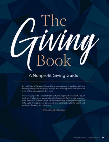 Sarasota Scene’s biennial Giving Book is dedicated to recognizing the important mission and work of many local non-profit organizations that serve the community in invaluable ways. From the arts to human services from education to social welfare from the environment to animals, nonprofits not only support needs and causes, but they also employ people and offer volunteer opportunities for those looking for more fulfillment in their lives. They are a driving force to the health and success of our community.