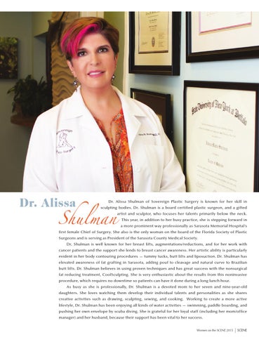 Dr. Alissa Shulman of Sovereign Plastic Surgery is known for her skill in sculpting bodies. Dr. Shulman is a board certified plastic surgeon, and a gifted artist and sculptor, who focuses her talents primarily below the neck. This year, in addition to her busy practice, she is stepping forward in a more prominent way professionally as Sarasota Memorial Hospital’s first female Chief of Surgery. She also is the only woman on the board of the Florida Society of Plastic Surgeons and is serving as President of the Sarasota County Medical Society. Dr. Shulman is well known for her breast lifts, augmentations/reductions, and for her work with cancer patients and the support she lends to breast cancer awareness. Her artistic ability is particularly evident in her body contouring procedures — tummy tucks, butt lifts and liposuction. Dr. Shulman has elevated awareness of fat grafting in Sarasota, adding pouf to cleavage and natural curve to Brazilian butt lifts. Dr. Shulman believes in using proven techniques and has great success with the nonsurgical fat reducing treatment, CoolSculpting. She is very enthusiastic about the results from this noninvasive procedure, which requires no downtime so patients can have it done during a long lunch hour. As busy as she is professionally, Dr. Shulman is a devoted mom to her seven and nine-year-old daughters. She loves watching them develop their individual talents and personalities as she shares creative activities such as drawing, sculpting, sewing, and cooking. Working to create a more active lifestyle, Dr. Shulman has been enjoying all kinds of water activities — swimming, paddle boarding, and pushing her own envelope by scuba diving. She is grateful for her loyal staff (including her mom/office manager) and her husband, because their support has been vital to her success. Women on the SCENE 2015