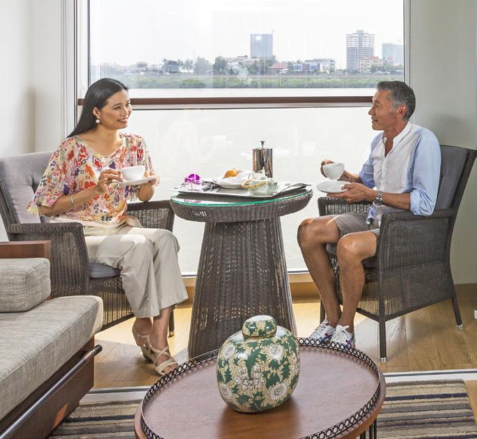 Featuring the largest lead-in suites on the Mekong, all suites on Scenic Spirit are one-bedroom balcony suites with separate living room, walk-in wardrobe and Scenic Sun Lounge. With a mini-bar restocked daily, luxury queen-sized Scenic Slumber Bed, and personalised butler service, you’re assured an exceptional experience in every suite. Enjoy nightly turndown service with gifts, complimentary Wi-Fi, in-suite safes and selfservice laundry facilities. Diamond Deck suites also include special privileges as detailed.