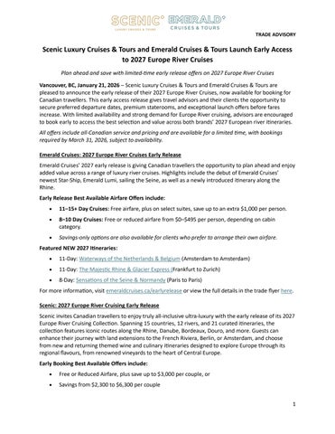 SAVE & SAIL EVENT 2023 Ultra-Luxury Europe River Cruising Exclusive Promotions* Limited time only, book by October 31, 2023 SUPER EARLYBIRD + BONUS SAVINGS FREE OR REDUCED ECONOMY AIRFARE * SAVE UP TO $1,700 * per couple Please quote promo code MAYBONUS23 at the time of booking. *Terms & Conditions: All offers are inventory controlled and may be extended or cancelled at any time without notice. Valid for new bookings and applicable to Future Travel Credit (FTC) bookings made by October 31, 2023. Super Earlybird offers are not combinable with Earlybird offers. Super Earlybird offer is not available for bookings where a Future Travel Credit (FTC) issued for previously cancelled flights. Full payment is due within 72 hours of booking for Super Earlybird offers to apply. Once sold out or if full payment is not received the Earlybird offer or best available offer will apply. Fly Free and special airfare offers, available on select 2023 departures excluding Portugal cruises. A non-refundable deposit of $500 per person is due at the time of booking with full payment required within 72 hours of booking. Scenic reserves the right to ticket the airfare upon receipt of full payment. Flights promotion is valid from 11 gateways across Canada towards the international economy airfare to Europe. This flight promotion is valid on specific classes of service with scheduled airlines of Scenic’s choice. Total ticket cost, including taxes,