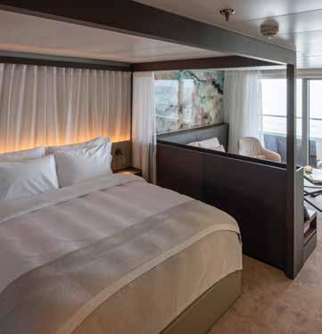 Located on the Diamond Deck, redefine industry standards with a stylish separate lounge area, oversized bathroom with a bath, and a private terrace featuring an outdoor Jacuzzi, day bed and 180° views from the bow of the ship. In addition to the features of the Grand Deluxe Suite enjoy private transfers, a bottle of Champagne on boarding, unlimited complimentary laundry services and a US$100 per couple on board Wellness Center credit.
