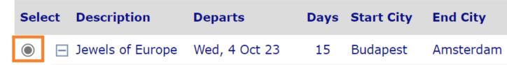 2. Select your tour (by clicking the circle to the left of the tour name) and “Next” at the bottom of the page