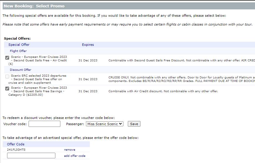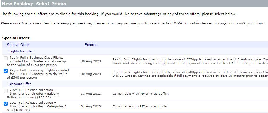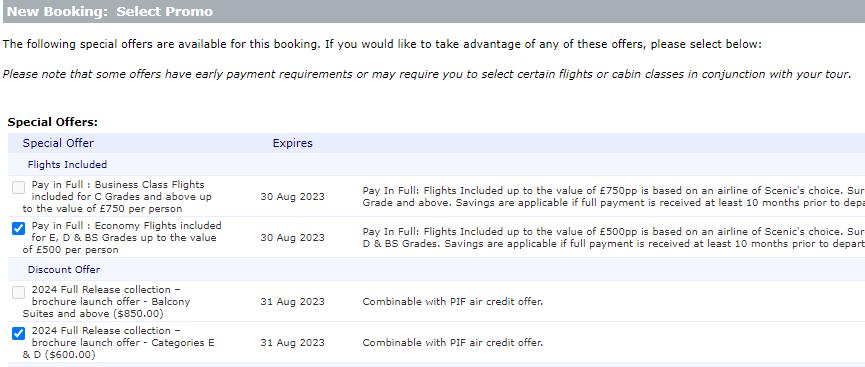 6. Select the applicable promotions for your cabin category: Select the best early bird deal for guests as well as additional offers such as early payment discount, and Scenic club offers. Tick box will grey out if not combinable with selected offer
