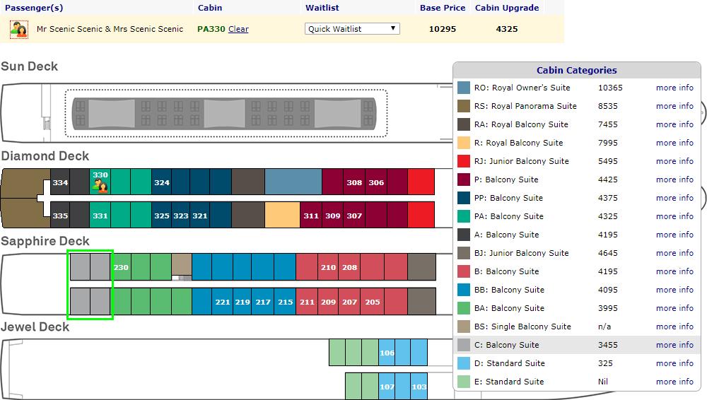 7. Select your suite: only the suites/staterooms with numbers showing are available to be selected. To waitlist a suite/stateroom type, click on the ‘quick waitlist’ drop down box or if you would like a cabin layout to select more info from the cabin categories box.